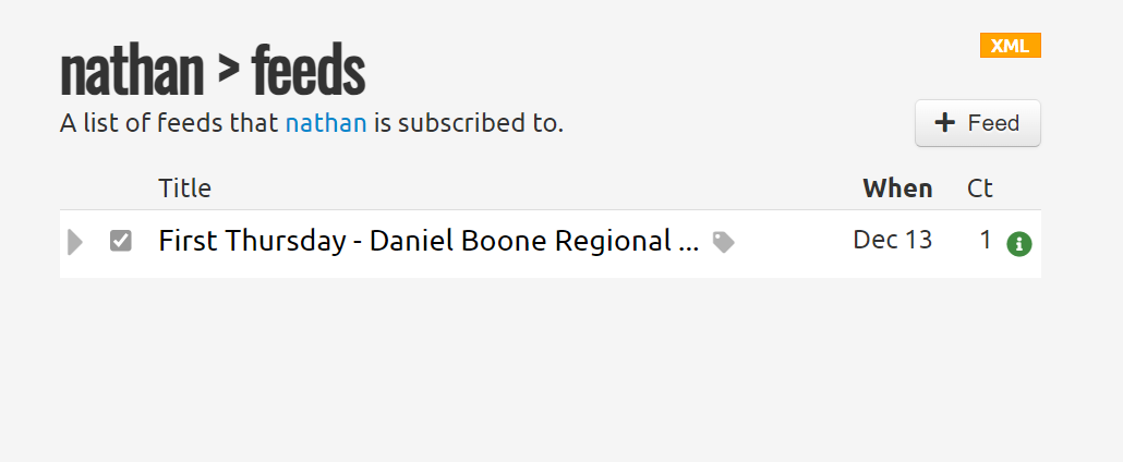 To subscribe to First Thursday’s feed, we need to get the feed’s URL. In this case we simply add /feed to the end of the First Thursday tag link above, like this: