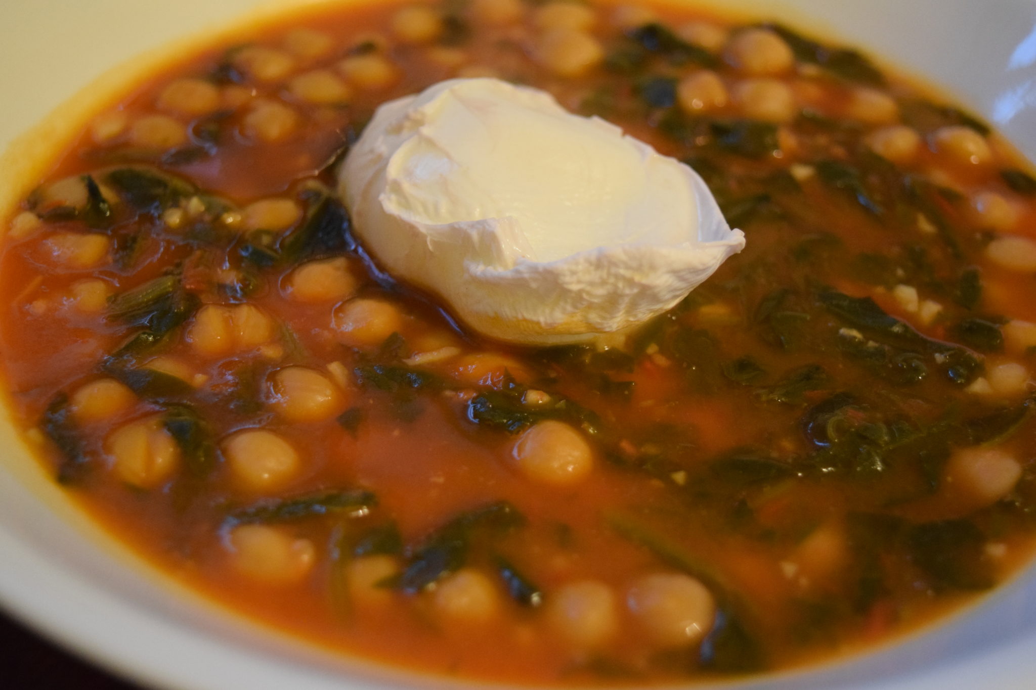 Very simple meal, pretty good though. I used fresh spinach and canned, no-salt-added garbanzos because we almost always have these on hand. I had one issue in preparing the tomato “pulp” because my tomatoes came from a coworker’s garden, which may have had an effect on water content, so I tried to reduce the sauce/pulp in a saucepan. The final dish had plenty of tomato flavor, was colorful and the poached egg was a nice touch.