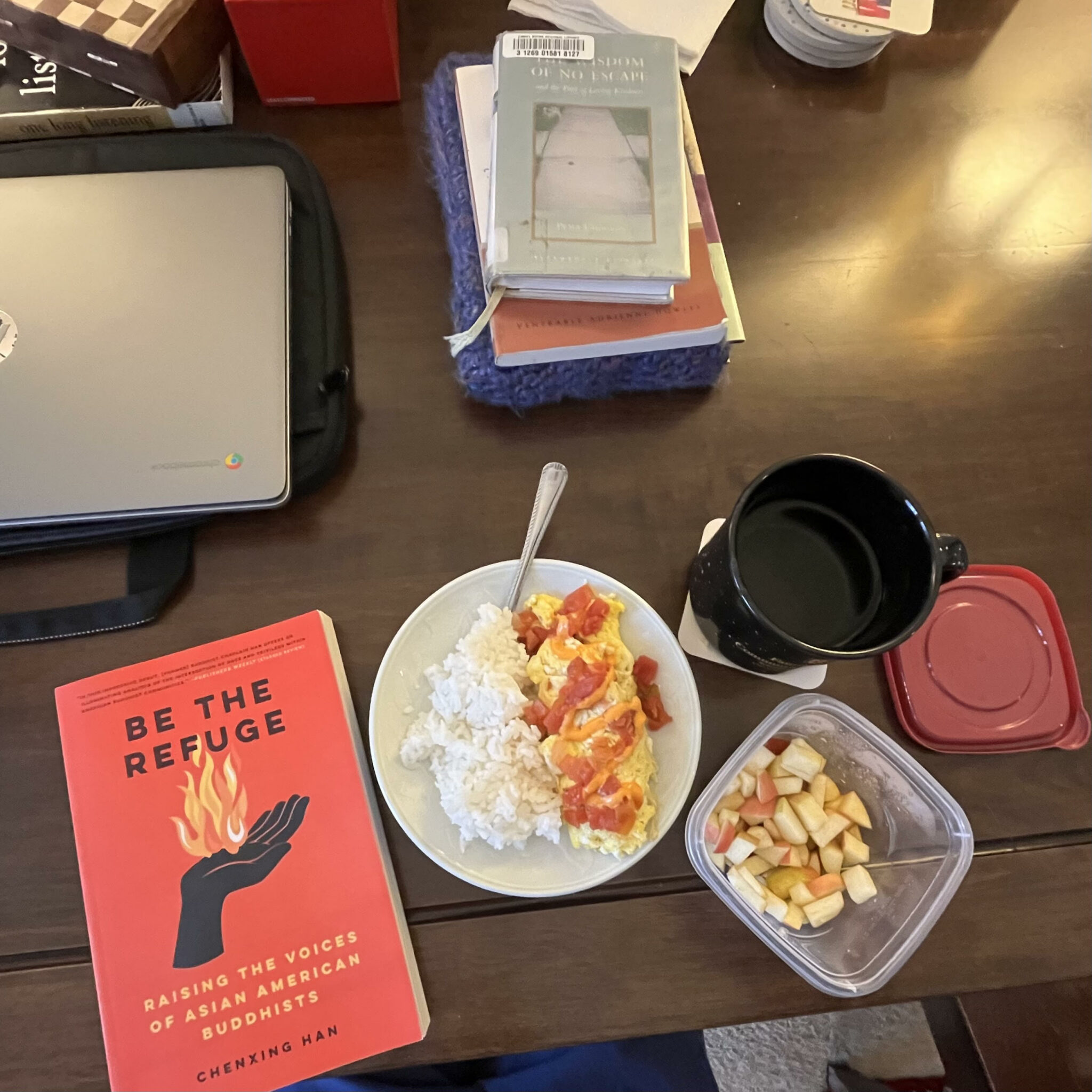 I read “The Art of Communicating” concurrently with “The Wisdom of No Escape” by Pema Chödrön, another beloved Buddhist writer and teacher. This book is a series of talks given by Chödrön in the spring of 1989. (You might find that the length of one talk is more or less compatible with the unhurried enjoyment of one meal + cup of tea.) I was fascinated by the discussion of tonglen meditation, which involves the visualization of darkness and pain on the in-breath and lightness and healing on the out-breath. “You will be surprised to find yourself more and more able to be there for others, even in what used to seem like impossible situations,” writes Chödrön in a blog post on this practice.