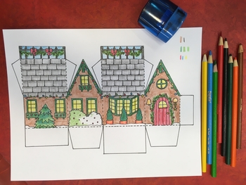 5) Using school glue or a glue stick, glue the tab at the right (by the front door) to the inside of the side with the fir tree. Then glue the bottom flaps to make a solid base.