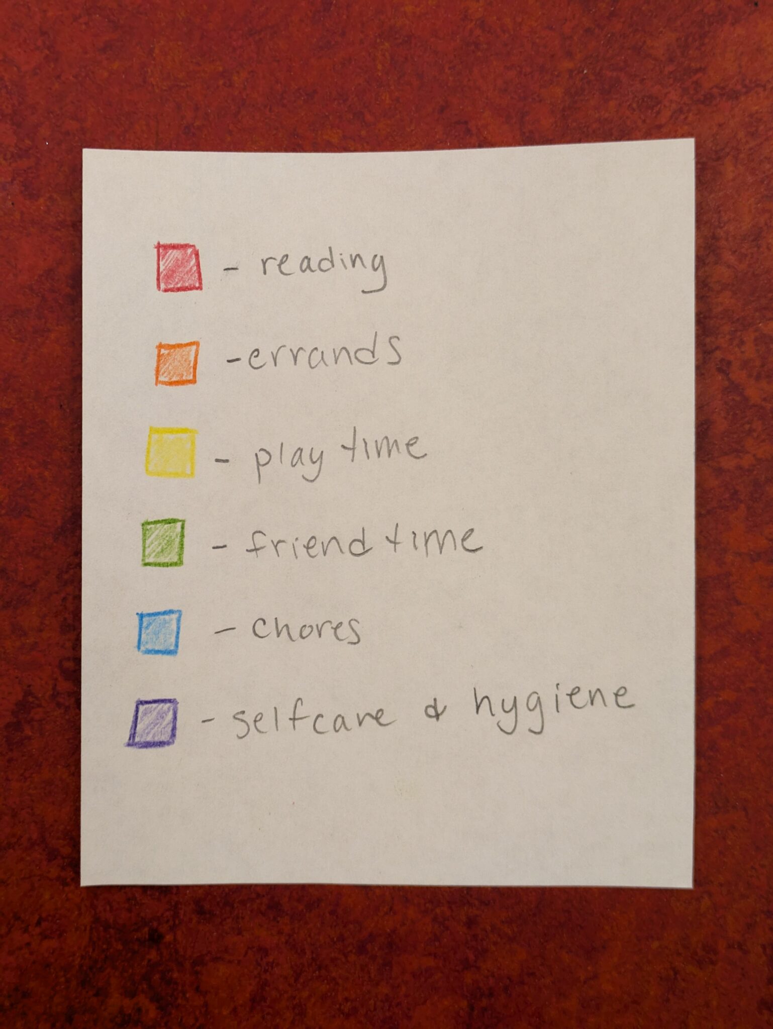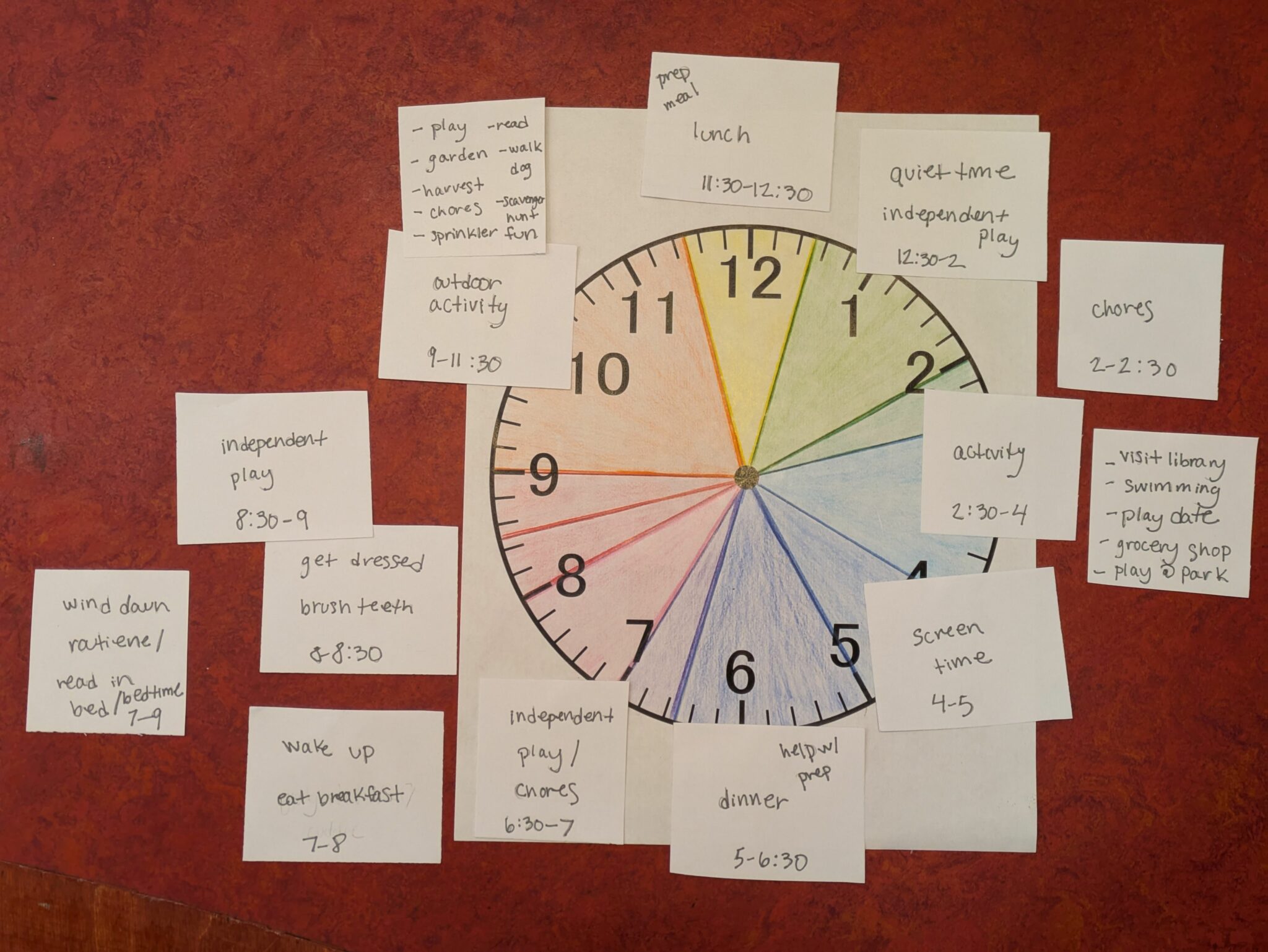 Including your children in this might be a fun activity for them. Having them help color in the slices of time and giving them choices (within reason) about how they want the daily rhythm to flow could help them feel like they have some autonomy in the daily routine. Depending on your child’s reading level, adding pictures would be helpful.