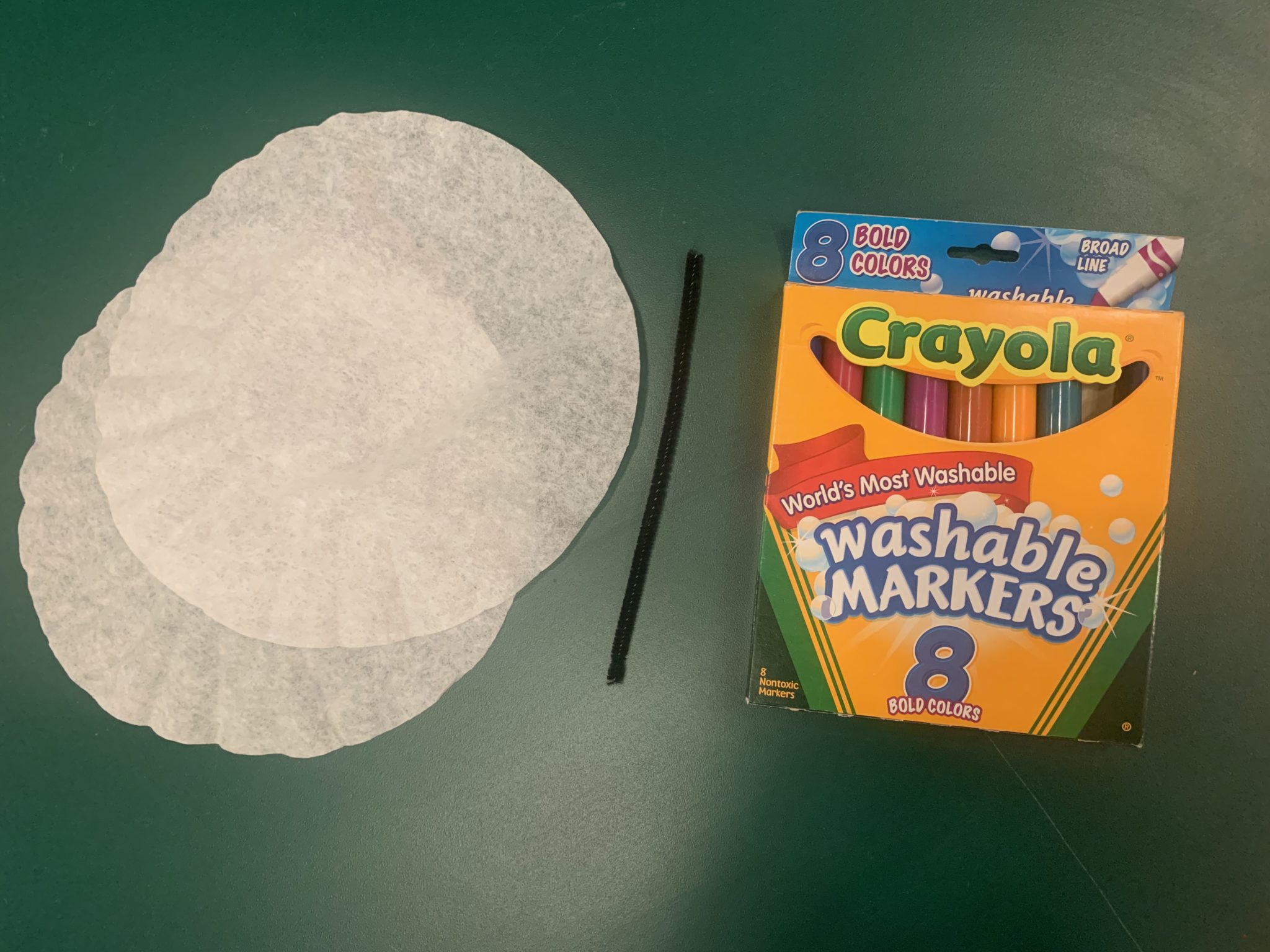 Now it is time for our butterflies to hatch from their chrysalises! For this craft, you will need two coffee filters, one pipe cleaner, washable markers and just a little bit of water.