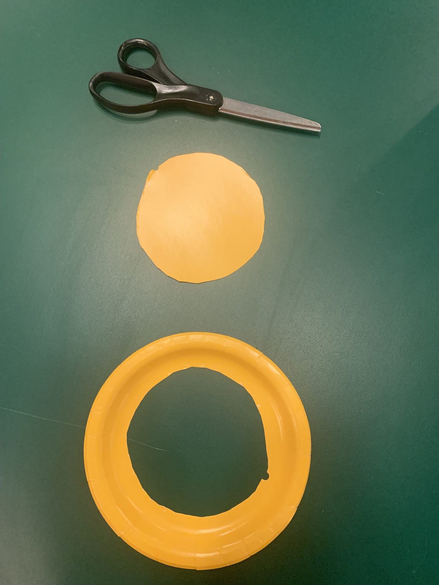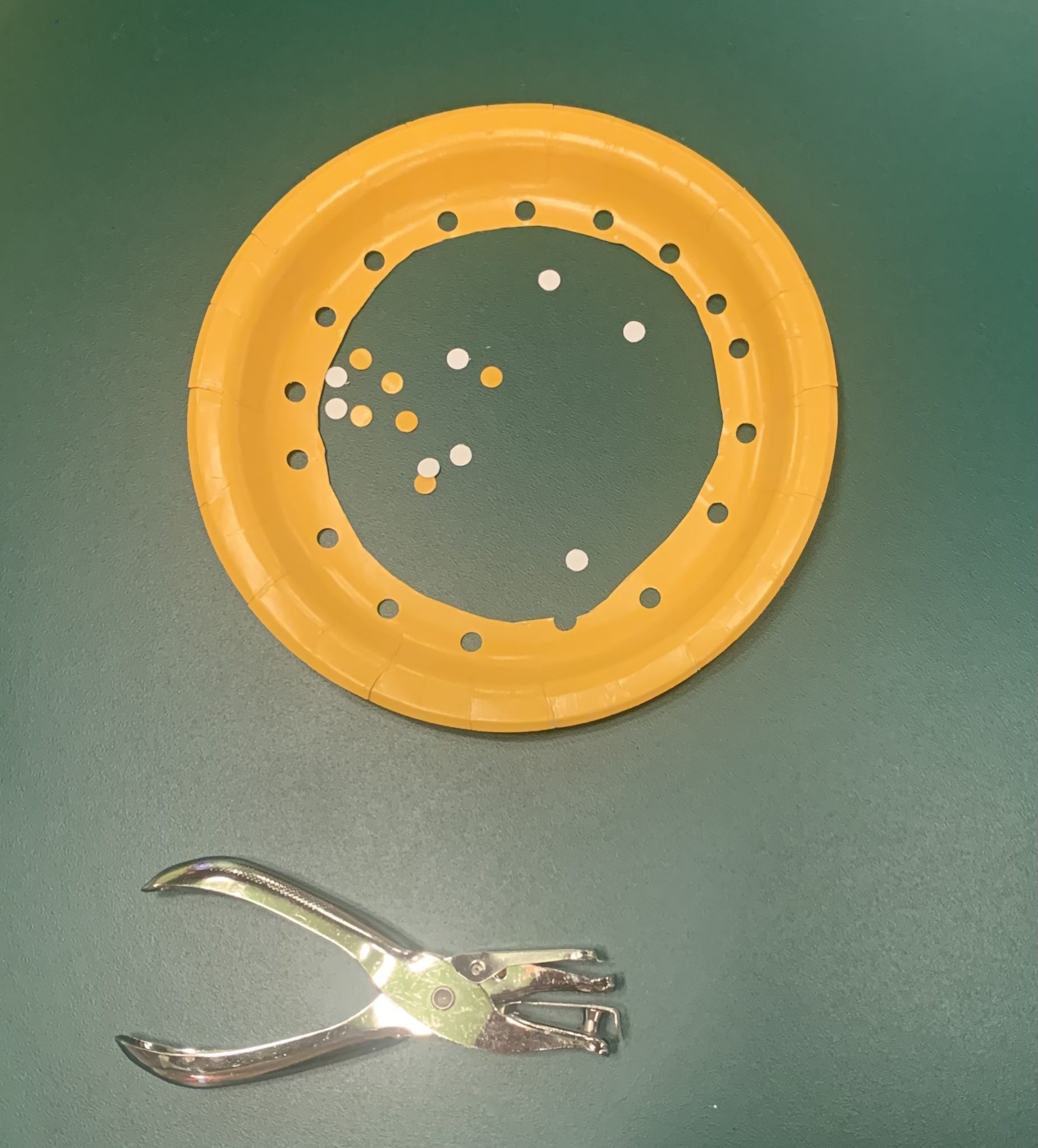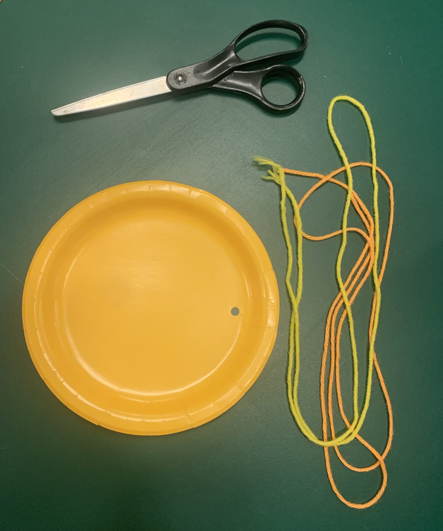 First, cut out the middle of the paper plate. (This was tricky for me — it might require some grownup assistance!) You want to have enough plate left over to punch holes around the edges to thread the yarn through.