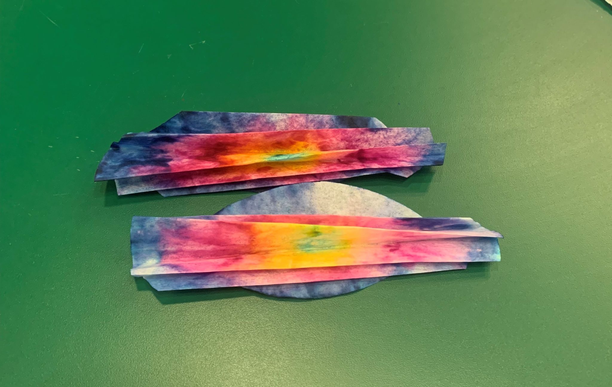 After you have colored the coffee filters, it is time to “tie-dyeify” the butterfly. Lay the coffee filters out on a few paper towels or a baking sheet. If you colored one coffee filter, lay the designed coffee filter on top and the plain one underneath it. If you colored both of your coffee filters, lay each one out separately. You only need a few drops of water to do this — a spray bottle or pipette could be used if you have these tools on hand. I just flicked a little bit of water onto my designed wings using my hands.
