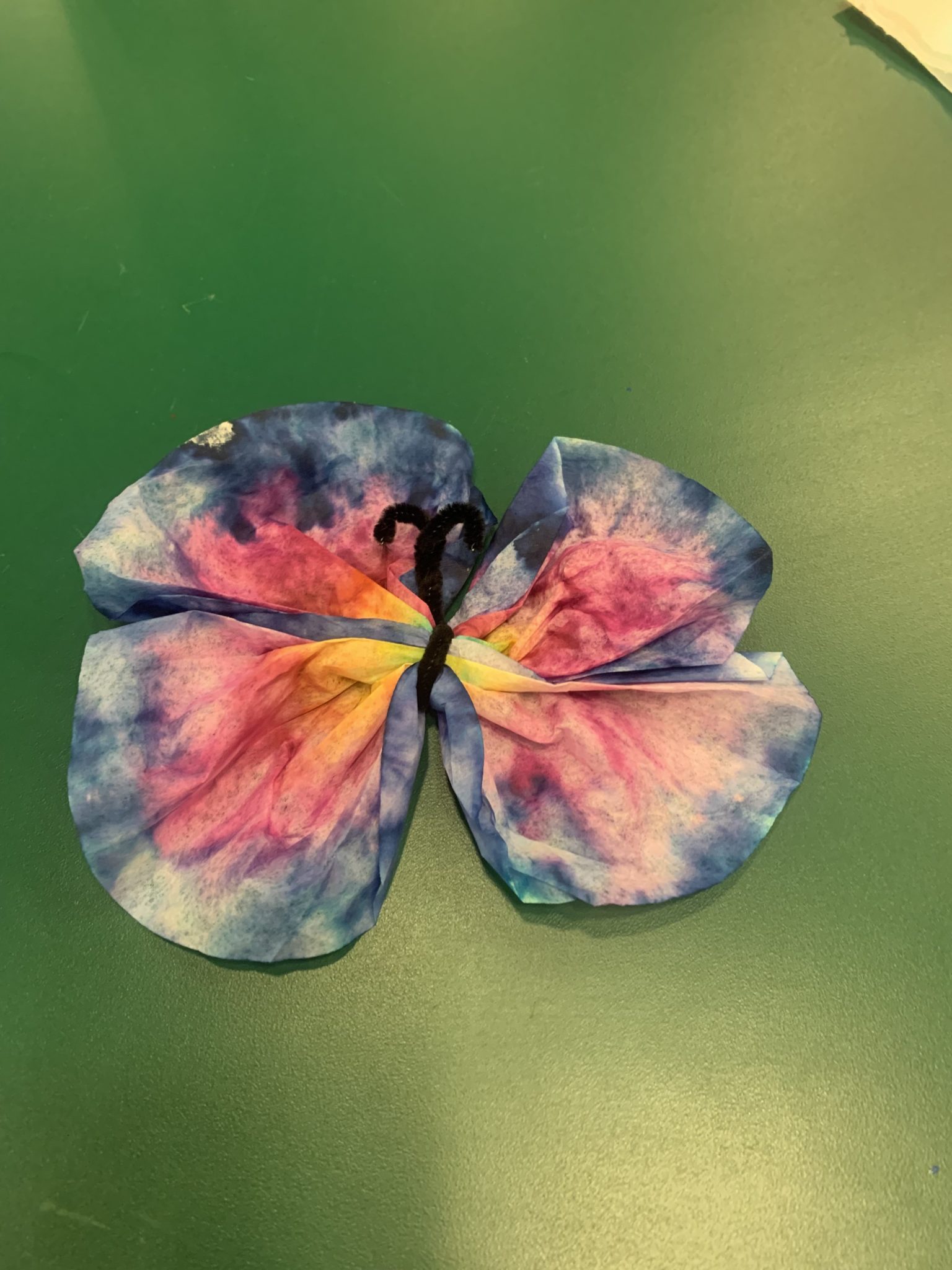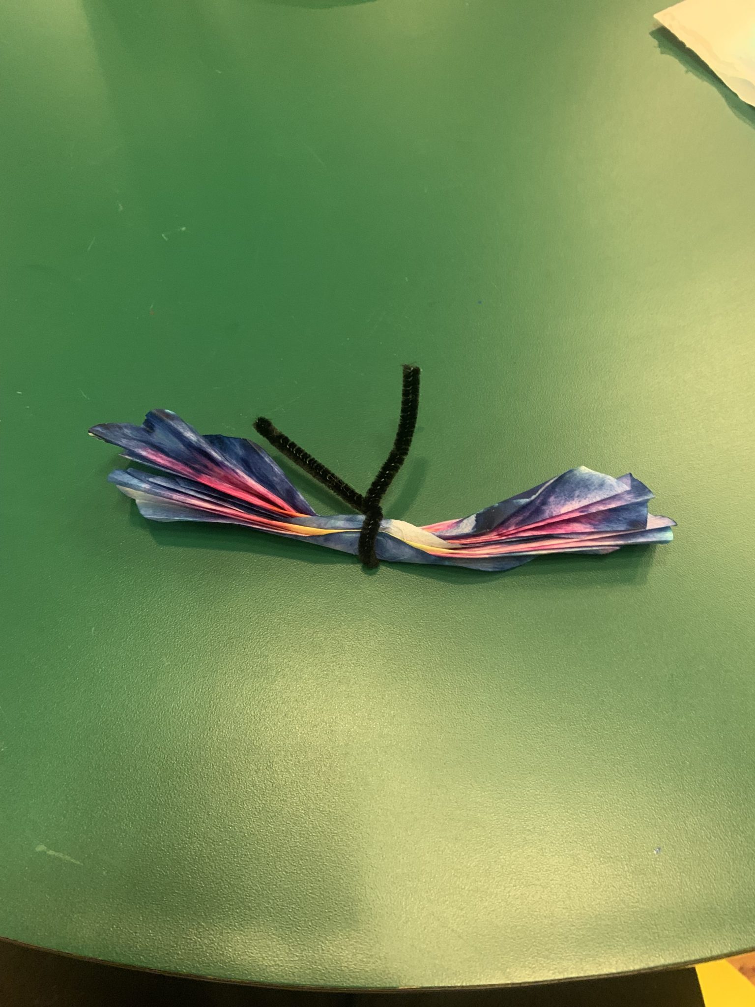 Once the butterfly wings are dry, the butterfly is now ready to be assembled. I folded each wing “accordion style” then pinched the middle of the wings together and wrapped the pipe cleaner around them.