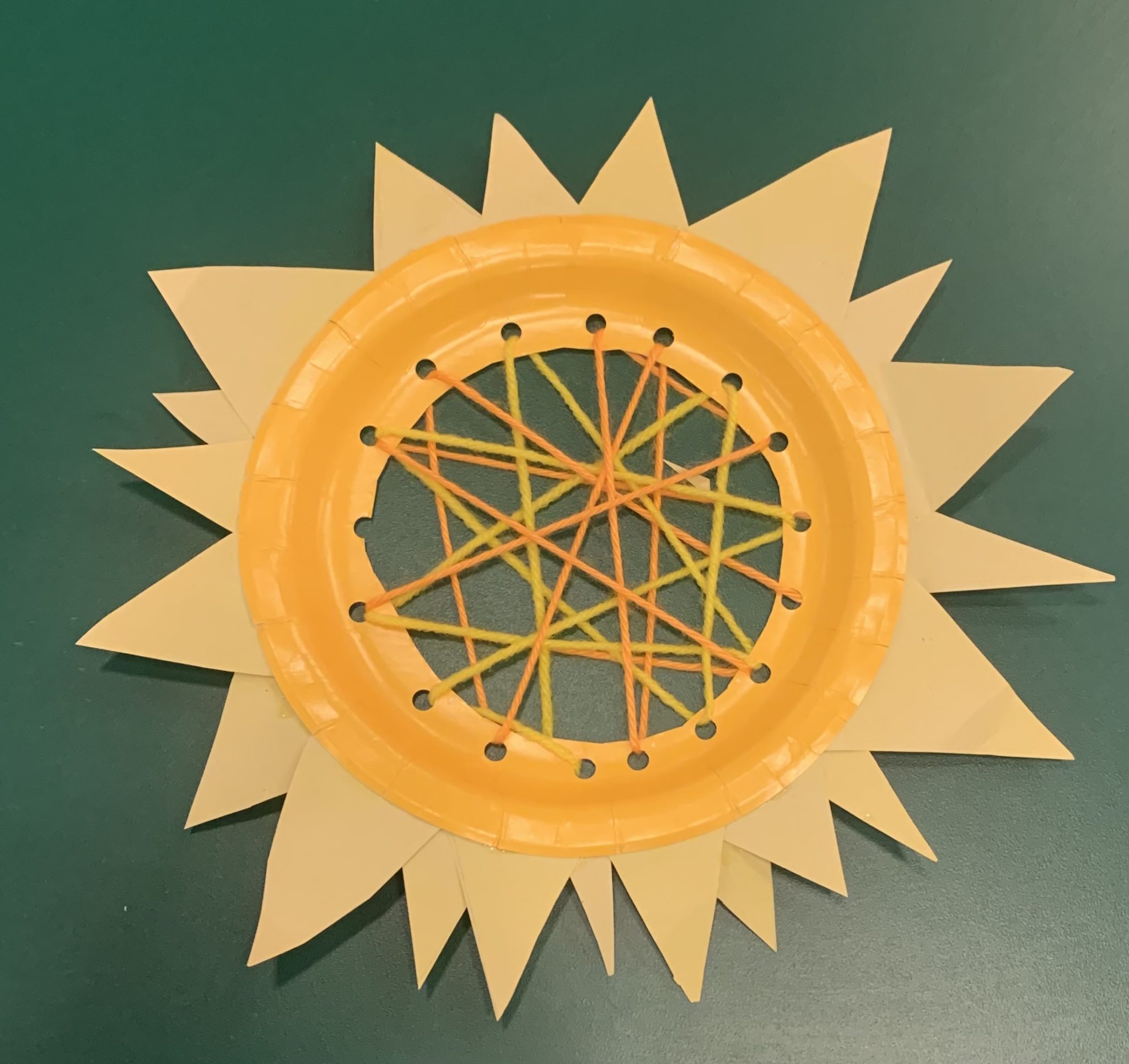 To spice up the sun, use two different pieces of yarn. Using different kinds of yarn makes the sun more colorful and adds texture! Repeat the process of taping the yarn to the back of the plate and thread this piece through until you have exhausted the yarn.