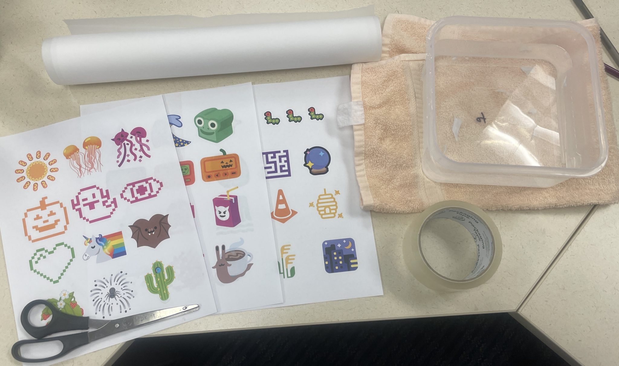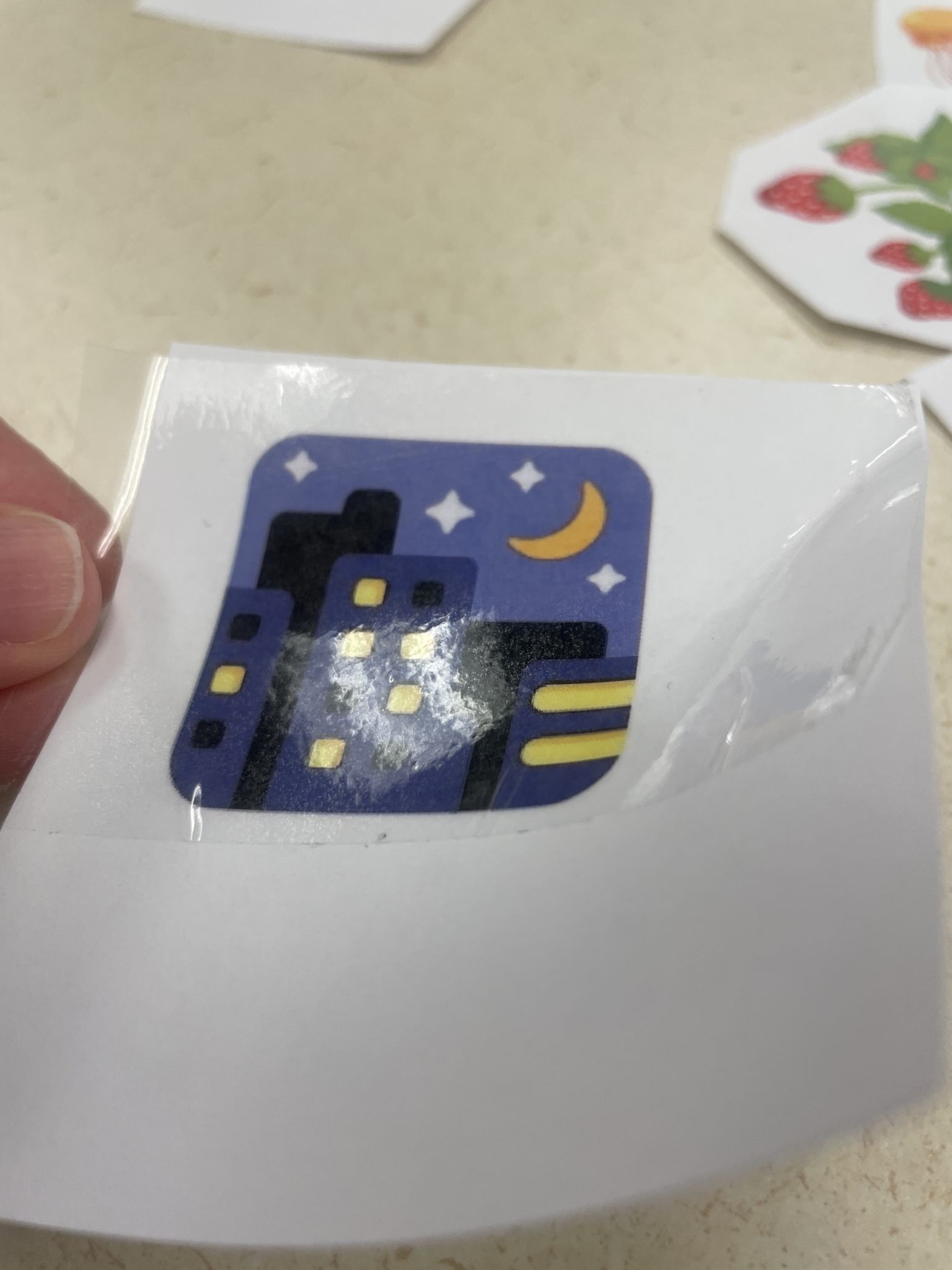 You could put packing tape over the entirety of the sample sticker sheets I linked above, but you’ll want to avoid air bubbles or wrinkles in the tape. Any place on your image that the tape doesn’t perfectly adhere to/lay flatly on will produce gaps in the image. But this distressed/faded look could also be a cool effect, as you will see later on in my night with stars emoji sticker: 🌃.