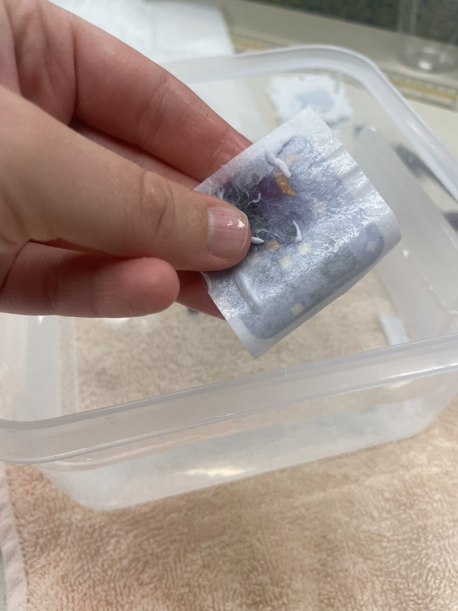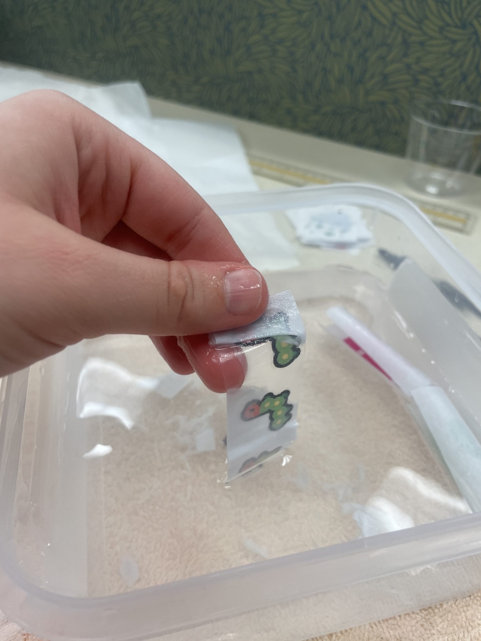 5. ✨Here’s when the mundane magic truly begins!!!✨ Take your taped-up image and drop it into the tub of water. The soon-to-be sticker will probably curl up immediately, but do not fret! Alchemy is at work. 🔮
